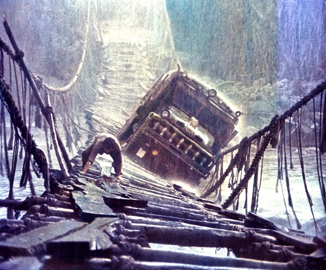 旅程中的异化:卡车过桥场景(全片高潮)以16分钟无剪辑长镜头呈现,物理空间的危险隐喻精神层面的崩溃。